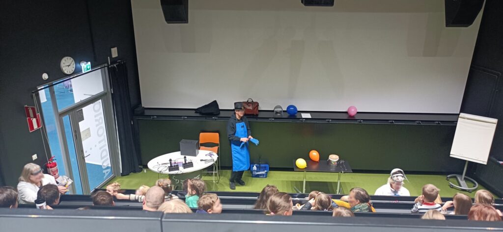 A 9h, le doyen accueille les enfants et leurs parents. Il porte un sweat à capuche avec l’inscription « keep cool and let the University dean handle it » et nous attend dans un amphi avec deux laborantines en tenue. Après une longue intro en finnois où je reconnais poussivement yliopisto (fac), opetayat (profs) et opiskella (étudier), les intervenants distribuent des ballons de baudruche à l’auditoire et lui demandent de les gonfler. Tous les ballons sont ensuite lancés vers la scène et le doyen s’équipe de vêtements de protection, met son chapeau de docteur, chapeau dont je parlerai dans un prochain article, et passe des ballons de baudruche dans l’azote liquide. Ils se transforment en fines galettes gelées puis, en se réchauffant, reprennent leur forme originale sans exploser. L’effet Waou est excellent et l’auditoire est captivé. Le doyen verse alors de l’eau dans l’azote liquide, provoquant une nappe de nuage de vapeur qui se répand sur le sol.