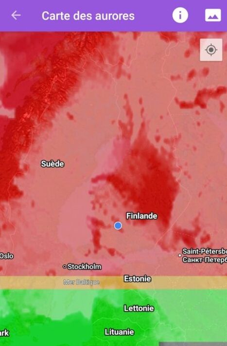 Mardi soir dernier, on avait invité des copains à venir manger. Qui dit repas, dit horaire de coucher plus tardive que d’ordinaire. À 22h les enfants étaient en train de se coucher, quand Maxime remarque que nous sommes dans une zone rouge pour voir des aurores boréales. C’était le lendemain de la grosse éruption solaire qui a fait que des aurores boréales ont été vues en Bretagne et ailleurs. Donc oui, heureusement qu’on est dans une zone rouge dans ces conditions, en étant dans un des pays chouchous pour venir admirer des aurores boréales.