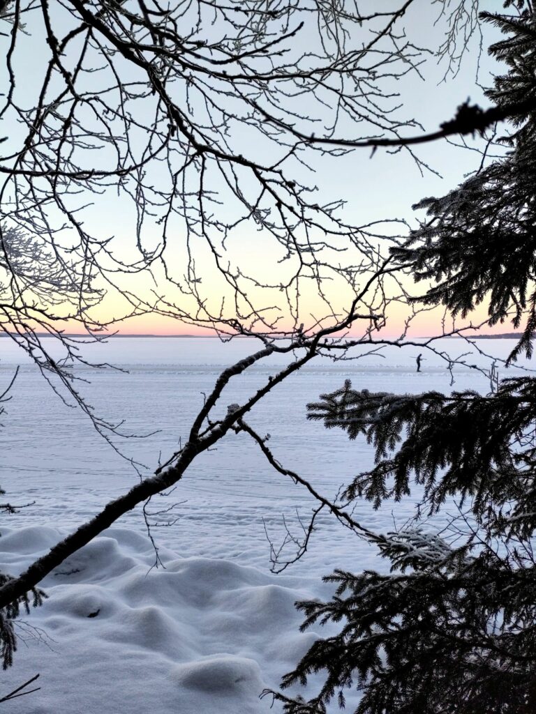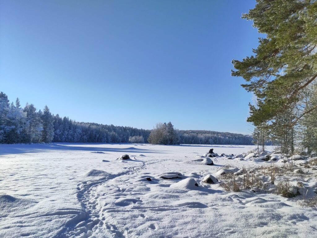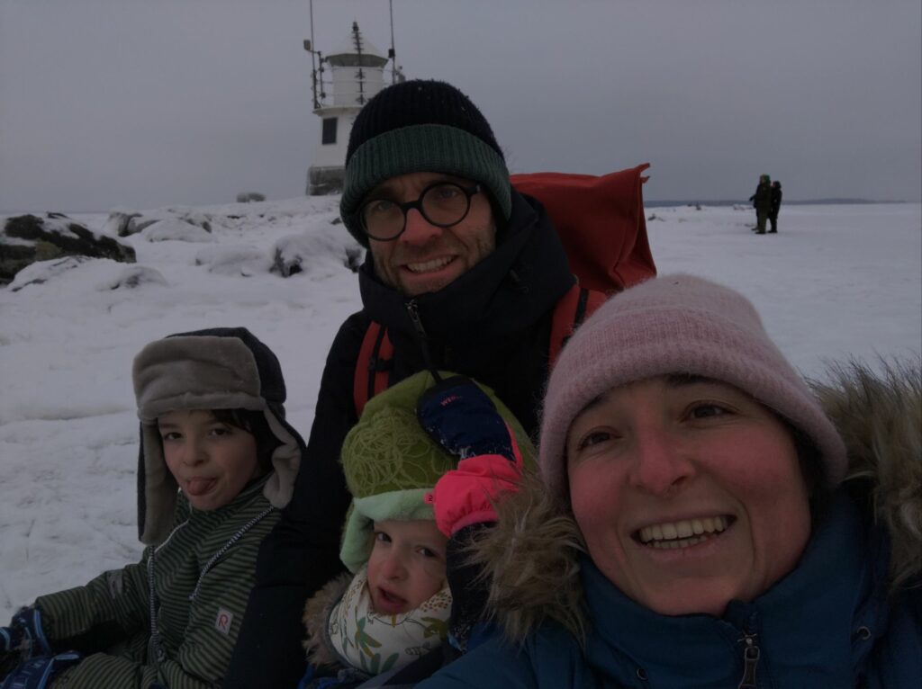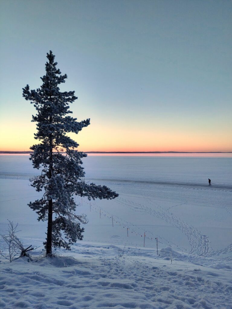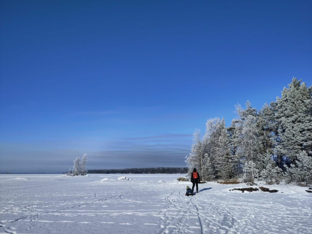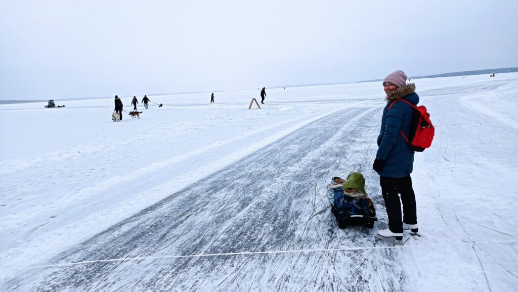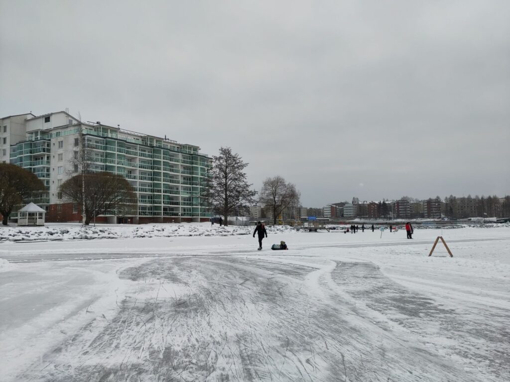 Aujourd’hui c’est samedi, il neige à petits flocons, il fait -10°C. L’ambiance est paisible dehors, contrairement à l’intérieur avec les chamailleries de la marmaille, alors nous sommes allés patiner sur le lac Näsijärvi. Une nouvelle expérience finlandaise grandiose!