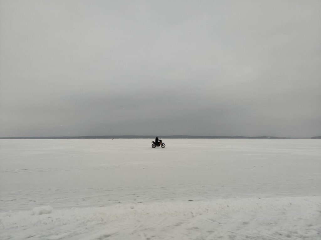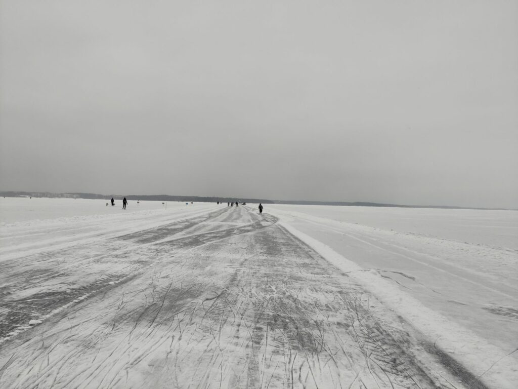 L’étendue gigantesque de blanc est traversée par une route damée qui permet de rejoindre l’autre côté du lac. Sans rire, une dameuse passe vraiment pour aplanir la glace et la rendre plus glissante pour les patineurs et les skieurs. On a même croisé un vélo et une moto, qui eux traversaient le lac en dehors de cette route.