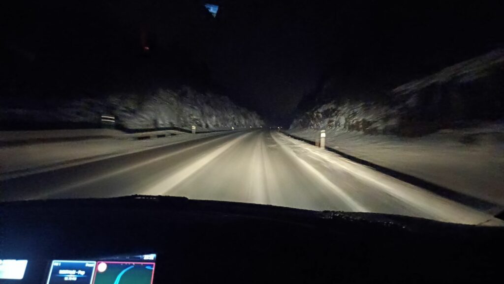 On est rentrés après 2h30 de route, l’aurore n’était pas pour ce soir mais au moins on a testé les pneus à clous à 80 km/h et fait le plein de la voiture, c’est déjà ça.