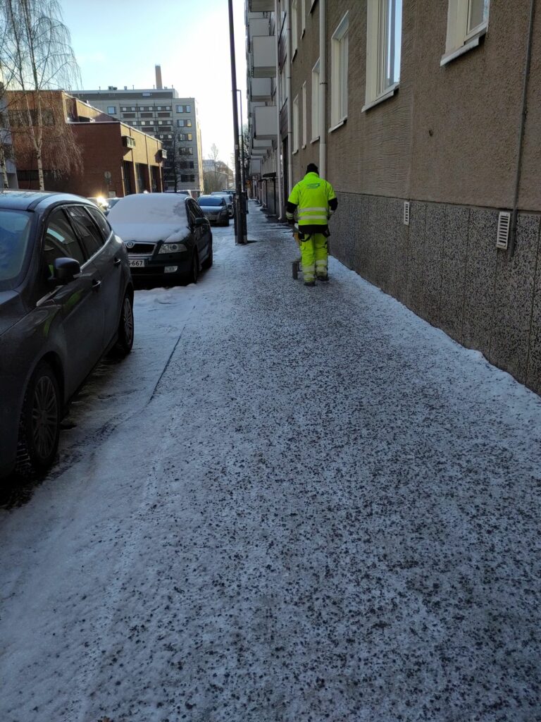 Les trottoirs sont parsemés de gravier anti-gel.