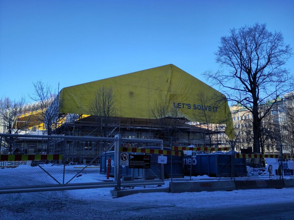 Les bâtiments dont la toiture est en réfection sont couverts d’un bâtiment temporaire en échafaudage. C’est le troisième qu’on a vu se construire dans le quartier.