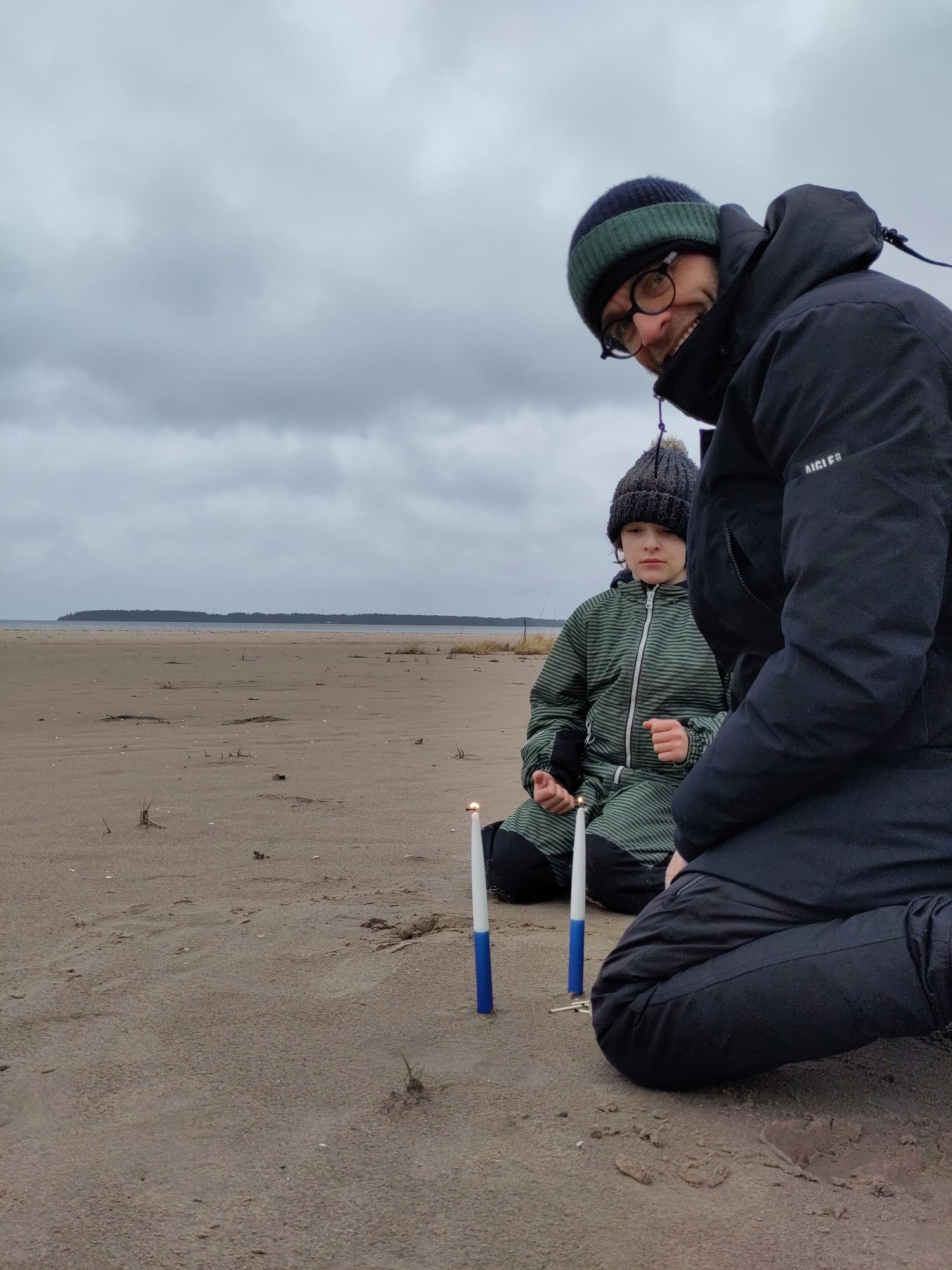 C’était aussi le jour de la fête de l’indépendance, alors on a voulu allumer les deux bougies de l’indépendance sur la plage. La tradition est de les placer derrière sa fenêtre le soir, en regardant le Président et sa femme serrer la main des 2000 invités à la « Itsenäisyyspäivän vastaanotto » (« Cérémonie du jour de l’indépendance ») tout en commentant les tenues avant de regarder « Tuntematon Sotilas » (Le soldat inconnu, 1955). Vue la difficulté qu’on a eu pour allumer nos bougies sous la pluie et le vent, on comprend que ce ne soit pas devenu une tradition.