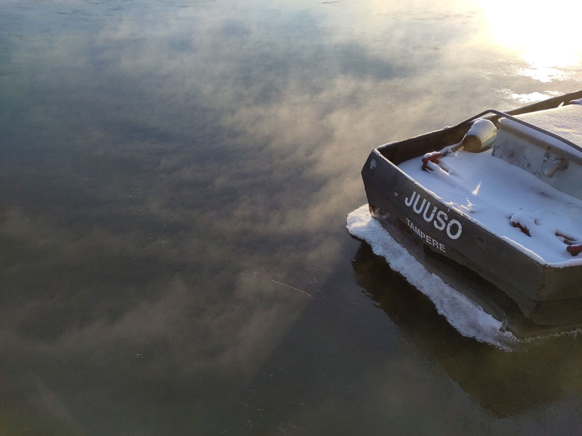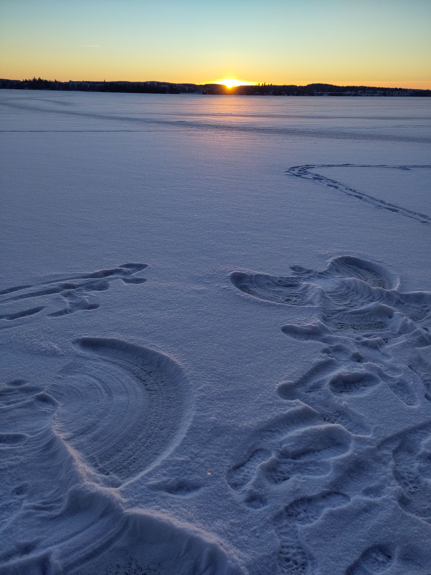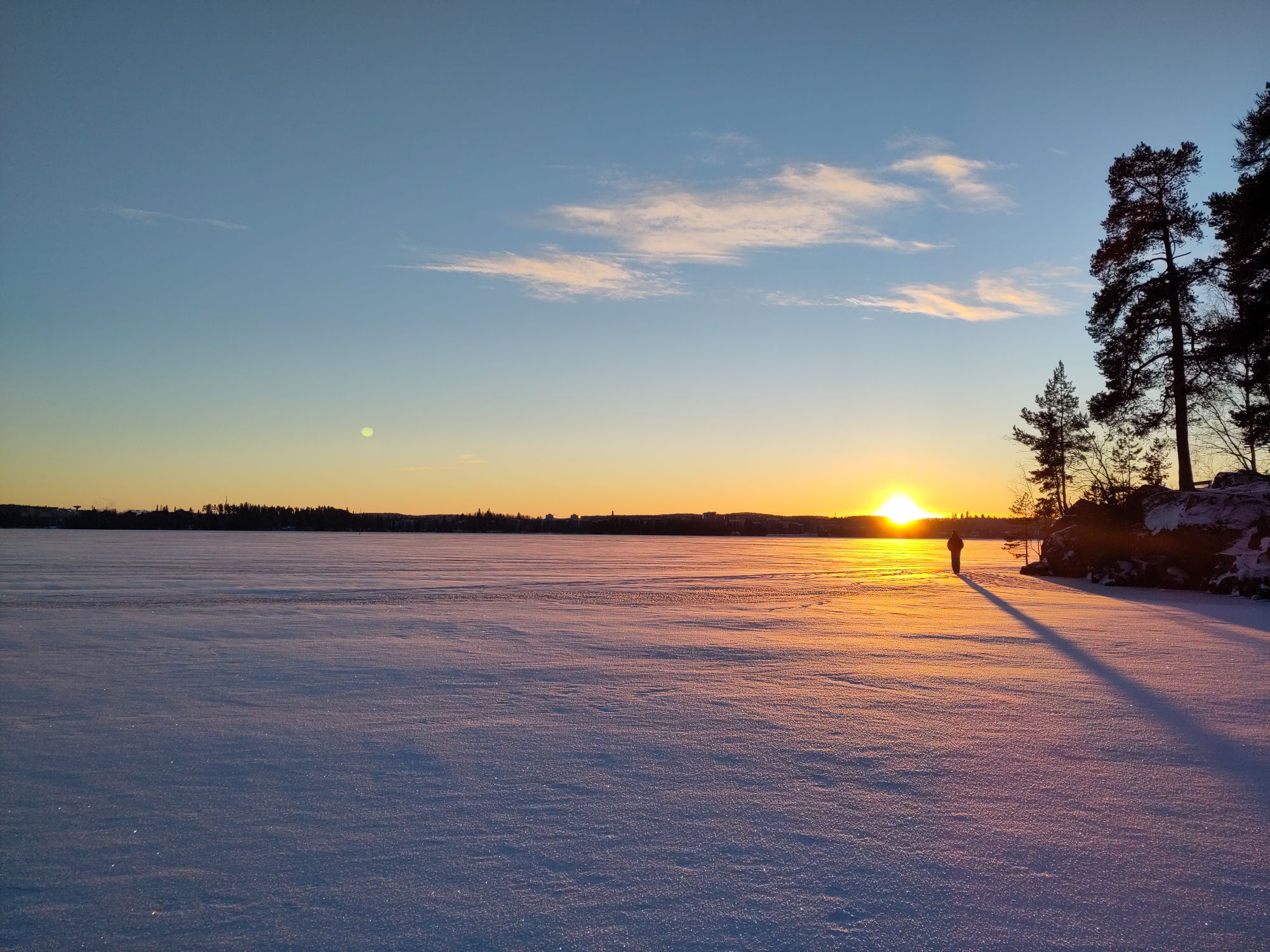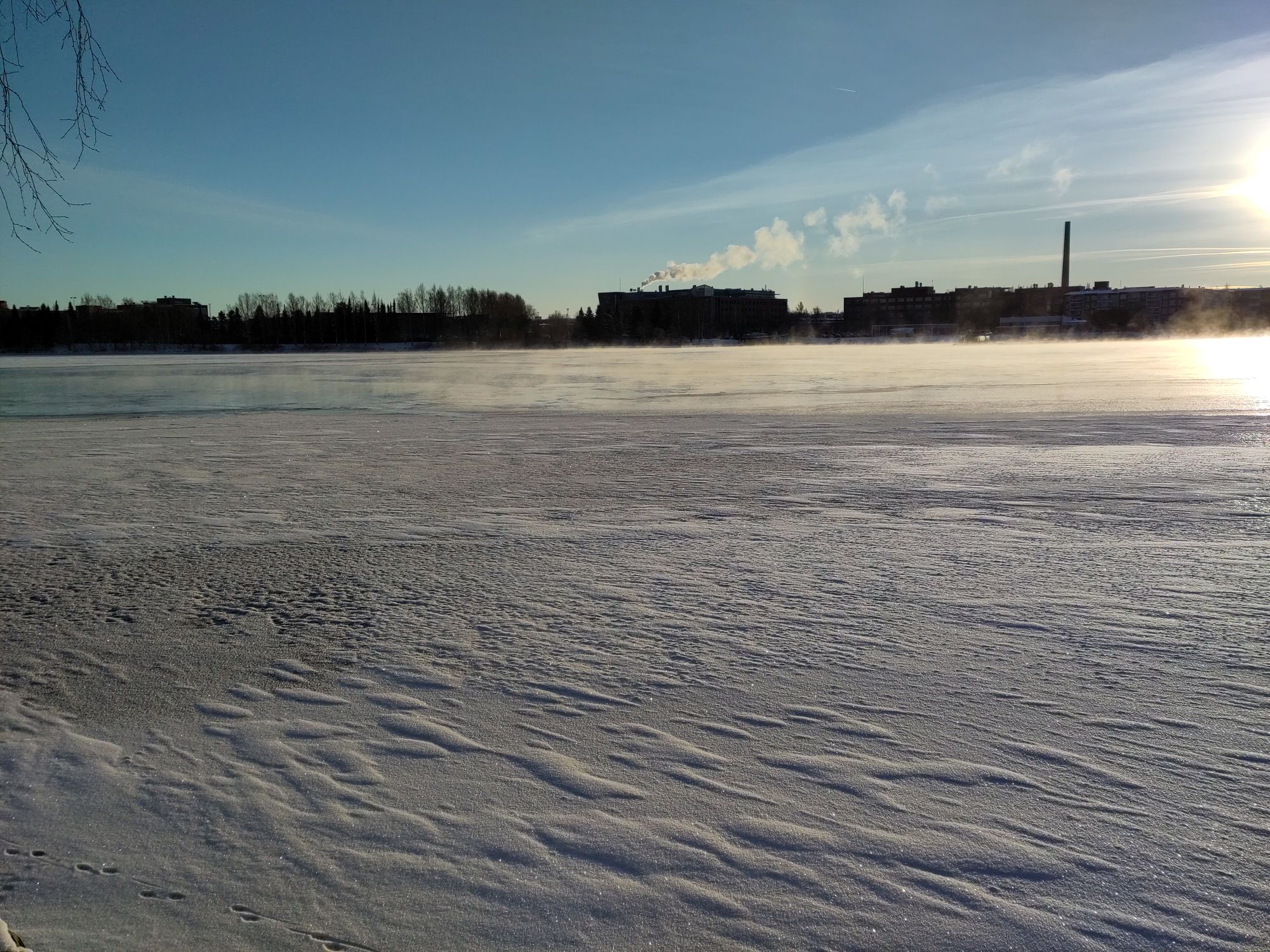 Promenade à Pyynikki au lever du soleil. La différence de température entre l’eau à 2°C et l’air à -17°C fait de la vapeur d’eau (enfin j’imagine, que les physiciens ne me jettent pas la pierre je n’ai pas vérifié cette information).