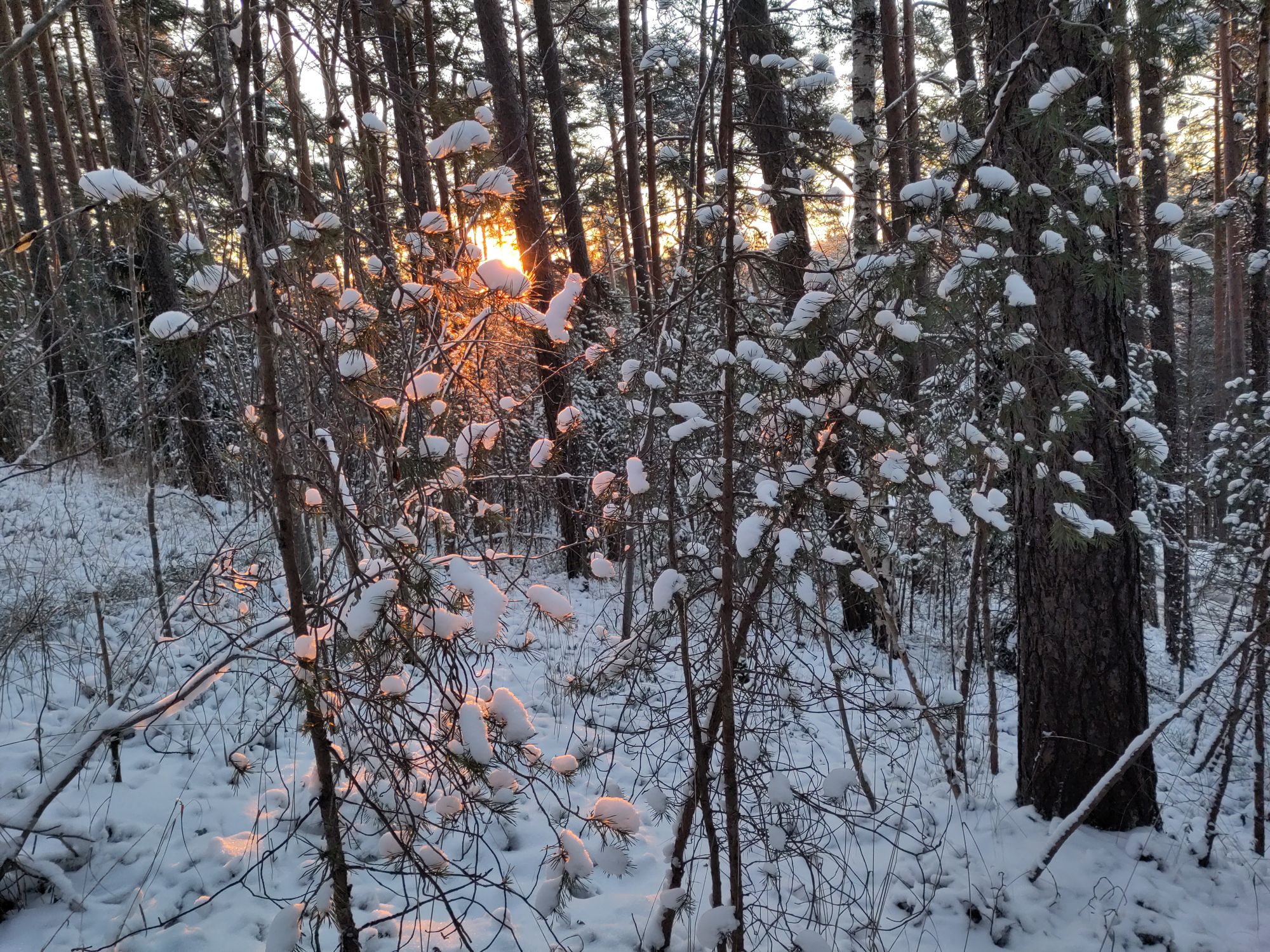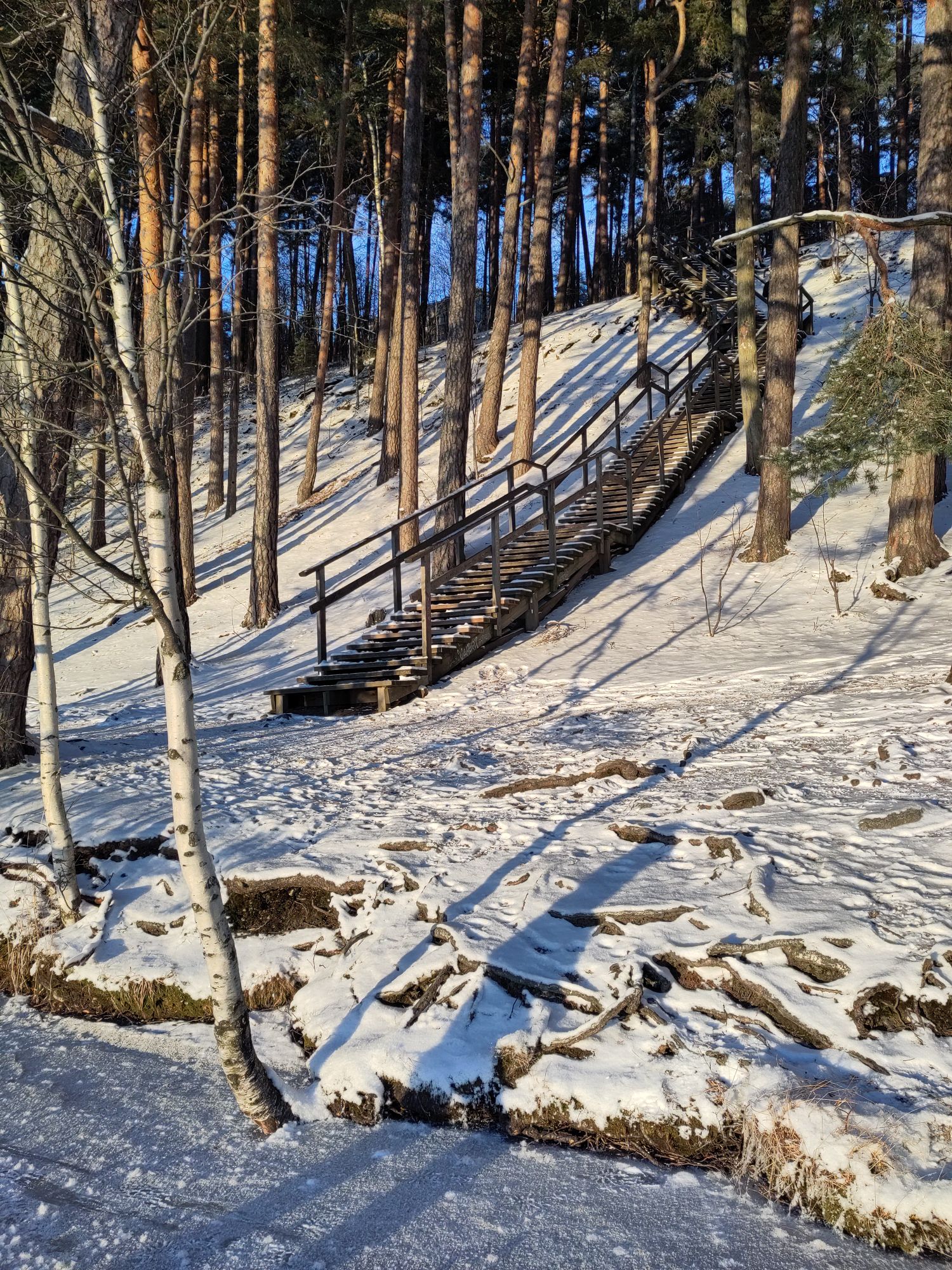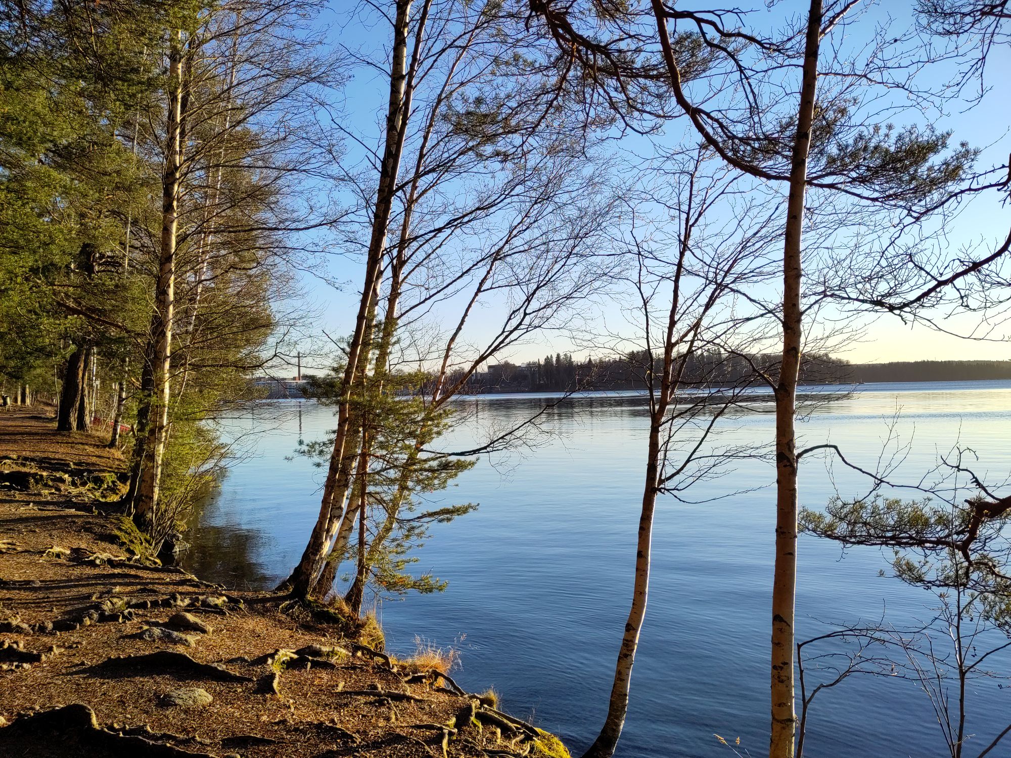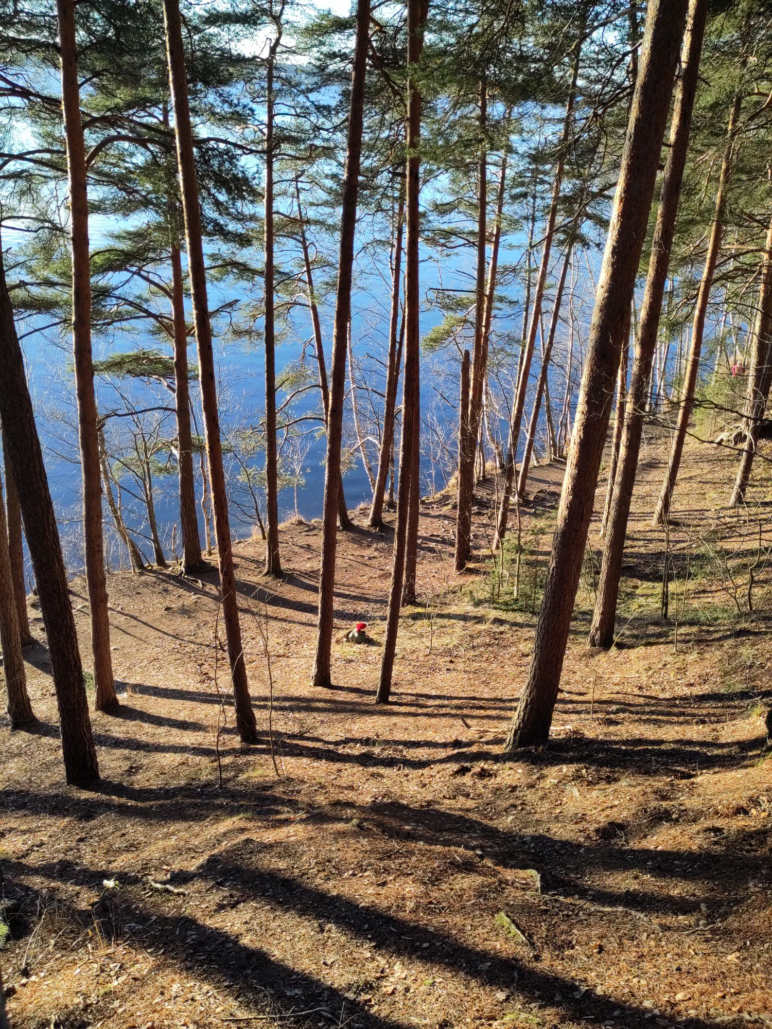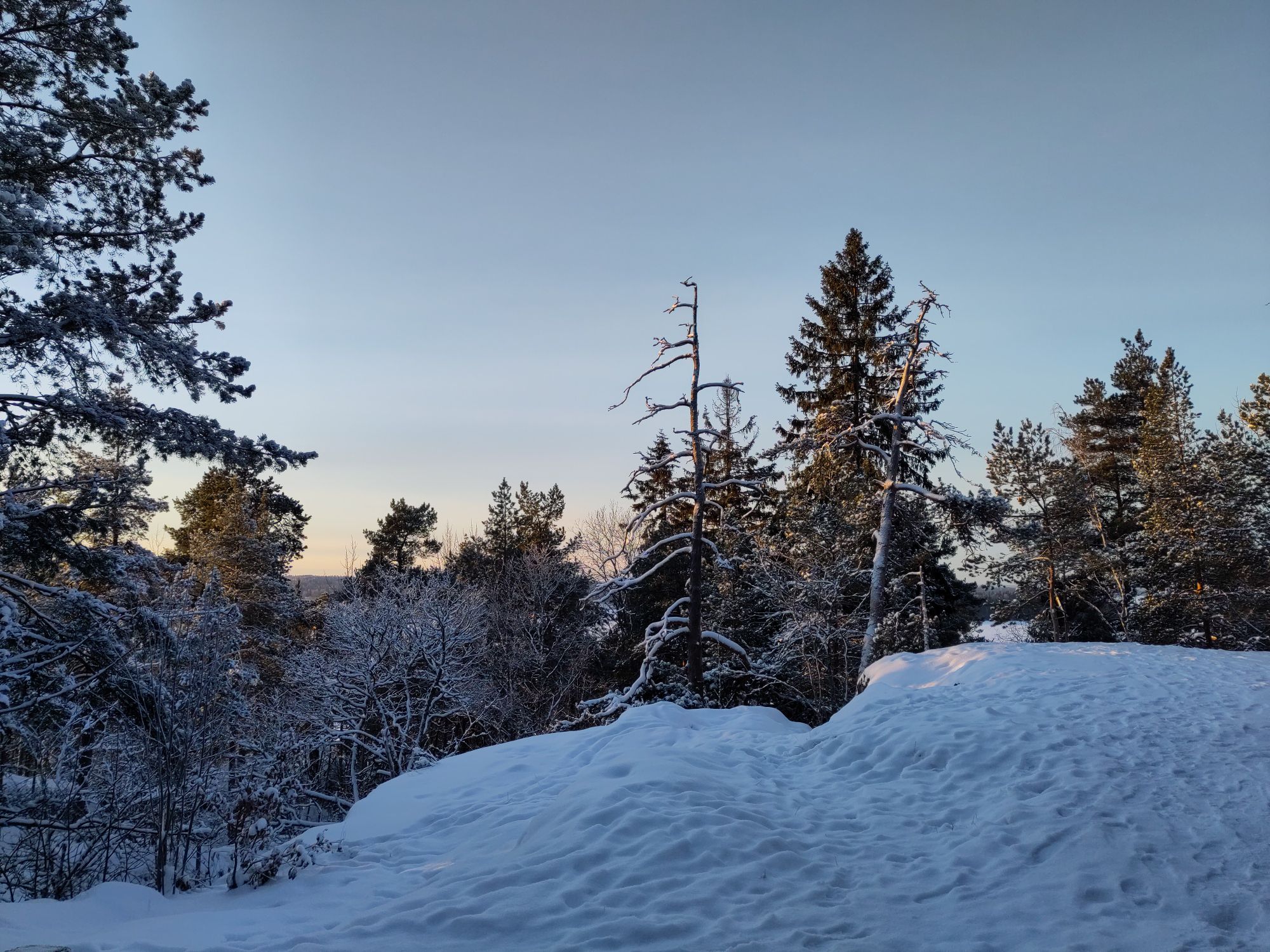 Promenade à Pyynikki au lever du soleil. La différence de température entre l’eau à 2°C et l’air à -17°C fait de la vapeur d’eau (enfin j’imagine, que les physiciens ne me jettent pas la pierre je n’ai pas vérifié cette information).