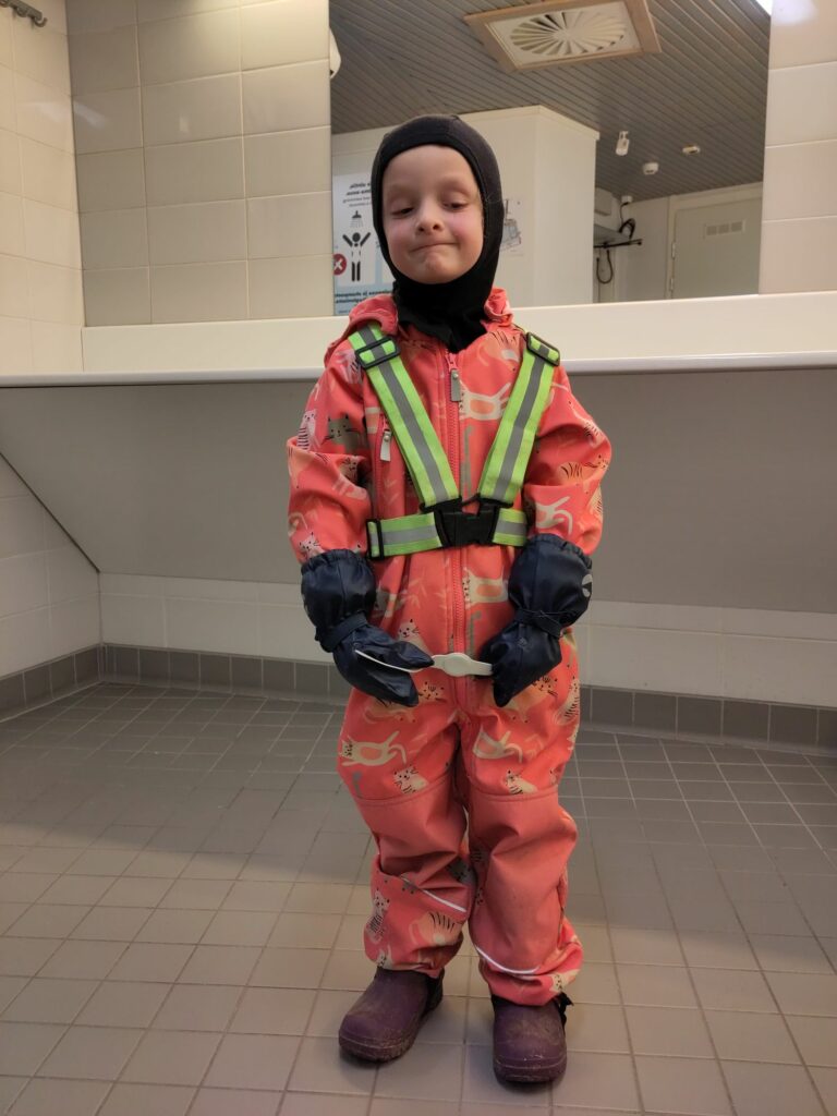 Je me suis longtemps demandé comment habiller Solal qui passe au moins deux heures par jour dehors, qu’il pleuve, qu’il neige, qu’il gèle ou qu’il vente. Il y a eu quelques loupés, malgré les recommandations du jardin d’enfants… En octobre Solal a eu froid aux pieds et on a acheté des chaussures Reima (marque Finlandaise !) qui tiennent jusqu’à -20°C et qui sont imperméables. Manque de bol, apparemment « imperméable » ne veut pas dire « insubmersible ». On a racheté des bottes fourrées qui tiennent les flaques et la boue, et gardé les autres pour le temps sec et la neige.