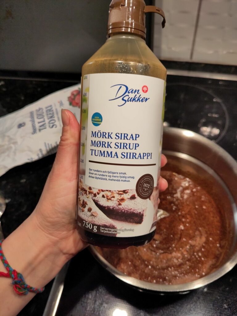 On prépare la pâte avec ce « sirop noir », qui est un sirop de sucre salé. C’est surprenant à goûter (lire: j’ai fait une tête de bébé qui goûte du citron pour la première fois quand j’ai léché la goutte sur mon doigt).