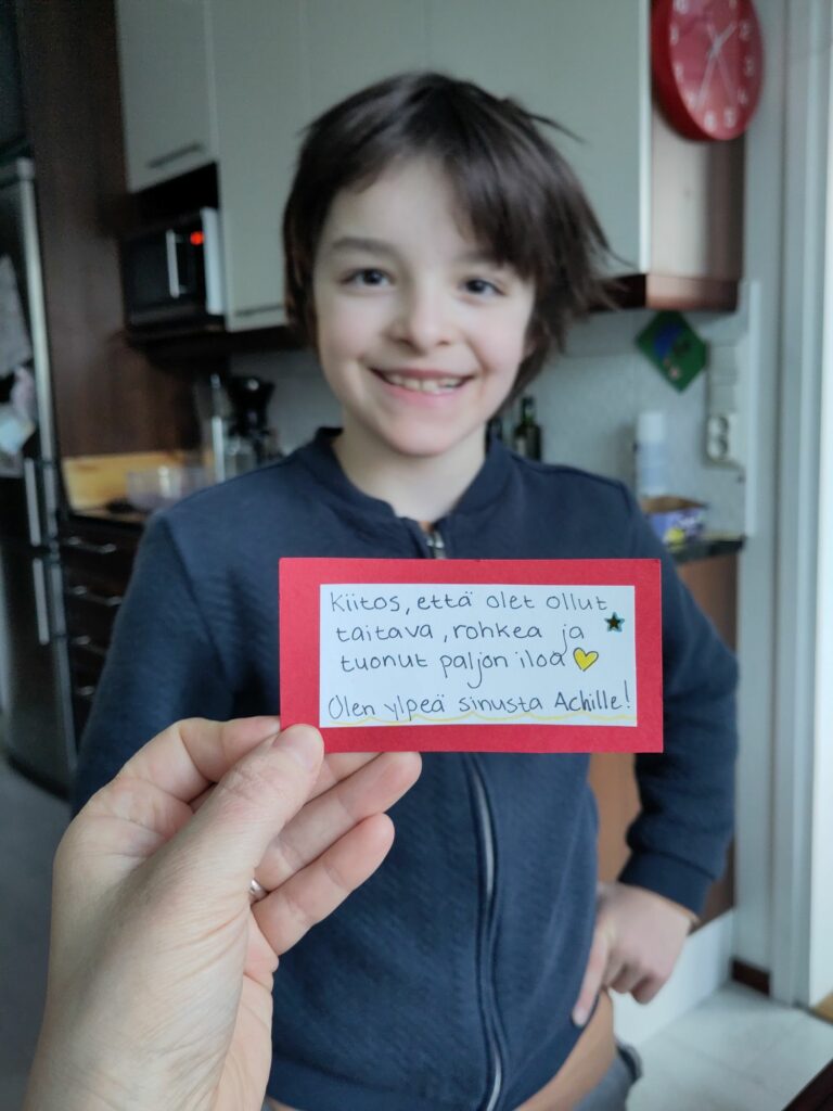 D’abord le jour de la rentrée, Achille a trouvé dans son casier un mot d’une maîtresse, qui le remercie pour son courage et pour la joie qu’il apporte, et qui dit « nous sommes fiers de toi ». Il était très heureux !