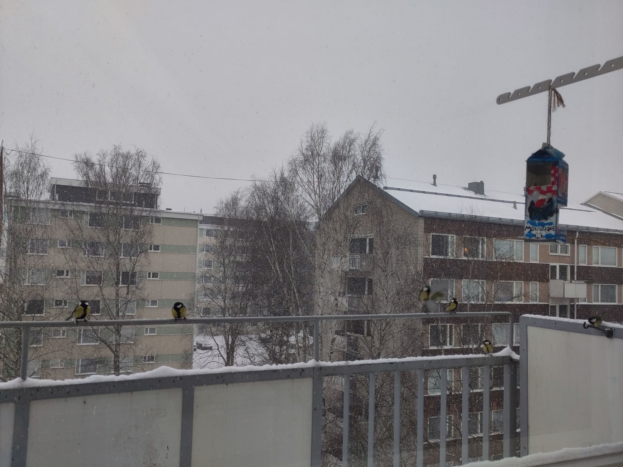 Les flocons qui tombent lentement sont toujours aussi beaux. Sinon, Solal a fabriqué une mangeoire pour les oiseaux, le balcon est à nouveau the place to be.