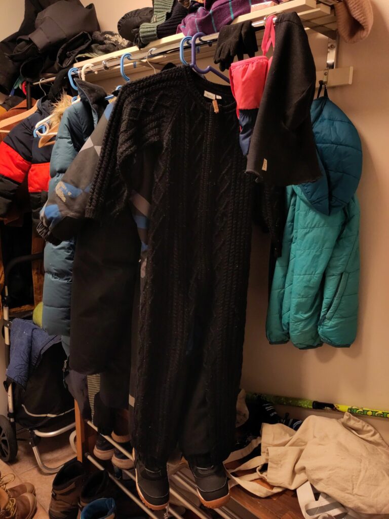 La combinaison en laine, les moufles et la cagoule parmi le bazar de l’entrée