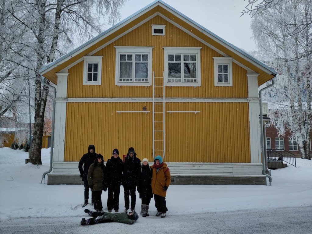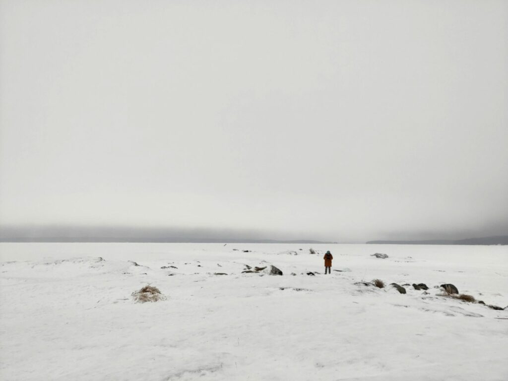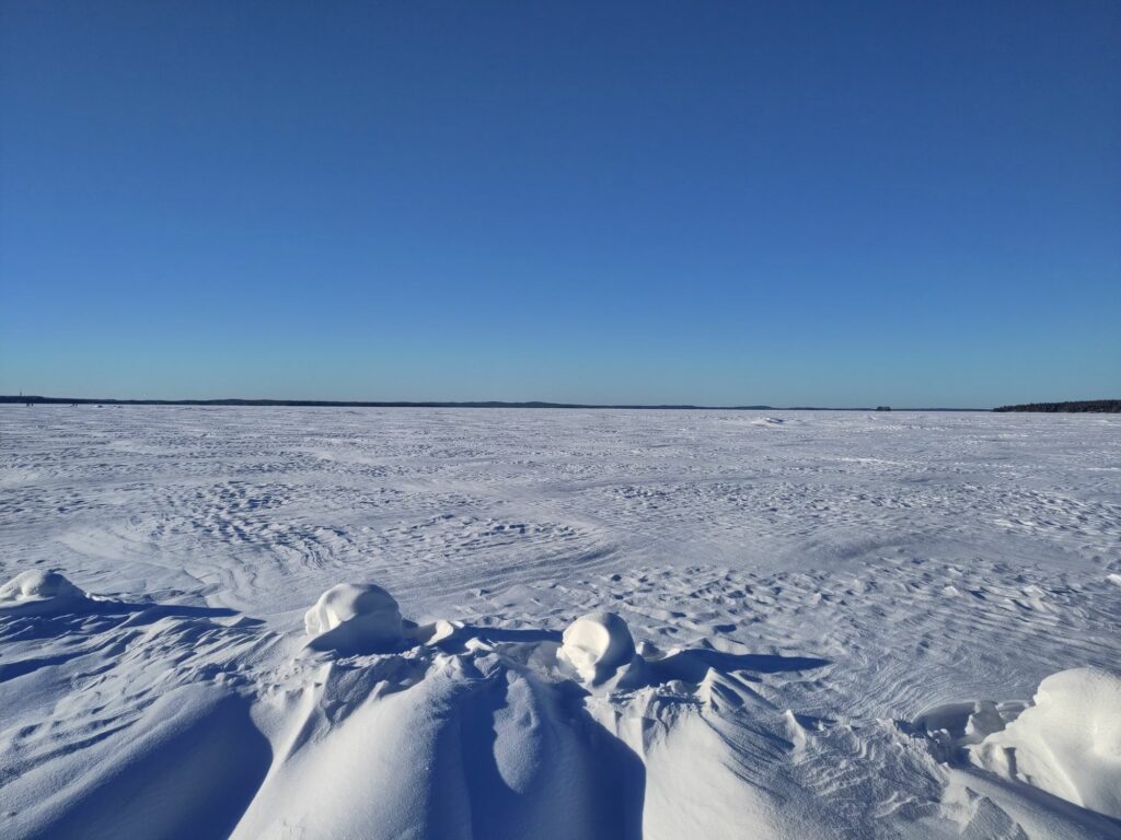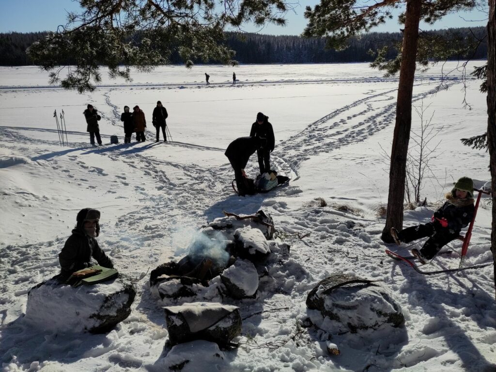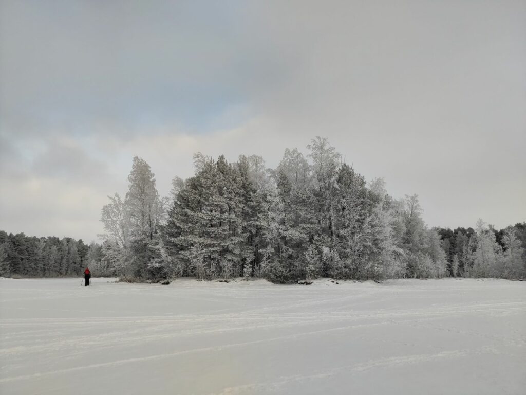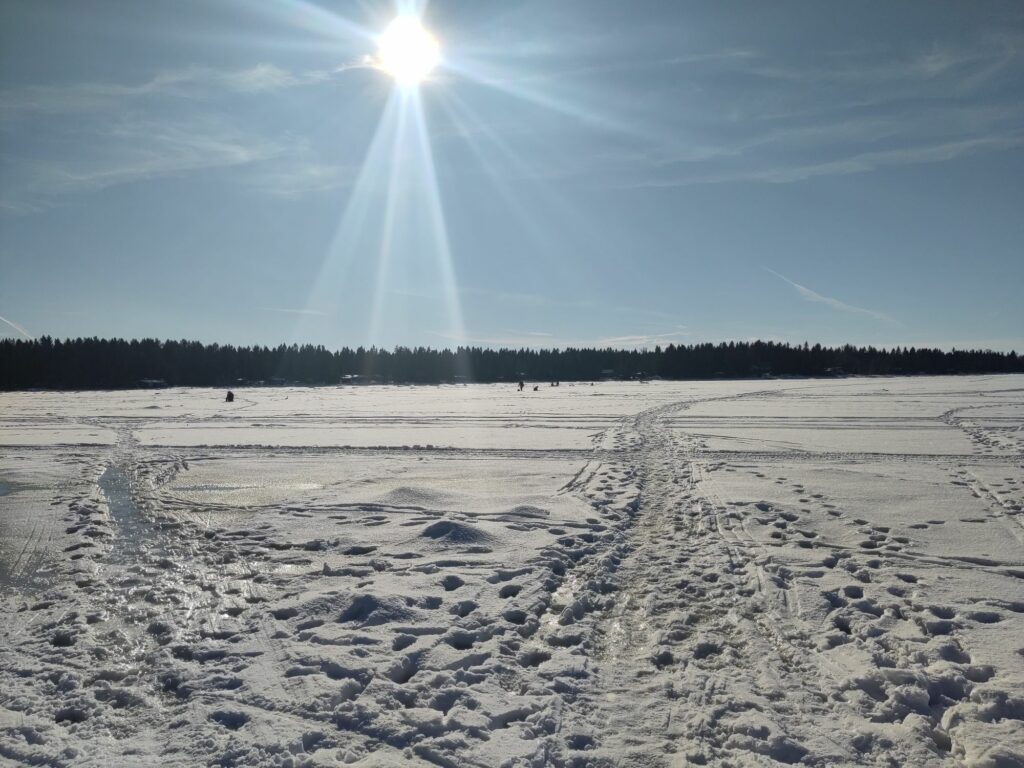 Lundi traversée du lac d’une rive à l’autre, plus de 10km de marche et de patinage pour certains, en partant par Kartano et le skate parc enneigé qui est devenu un parcours de skate-luge.