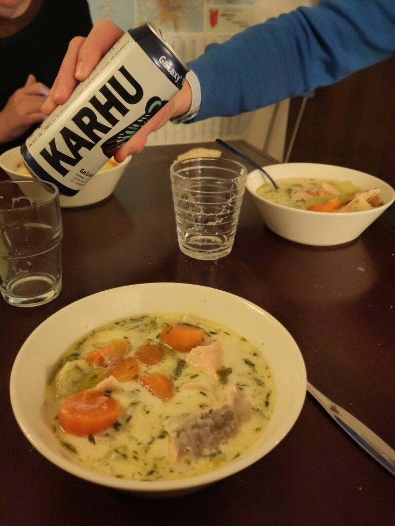 La « lohikeito », soupe de saumon crémeuse et la bière « karhu » qui est faite à Pori.