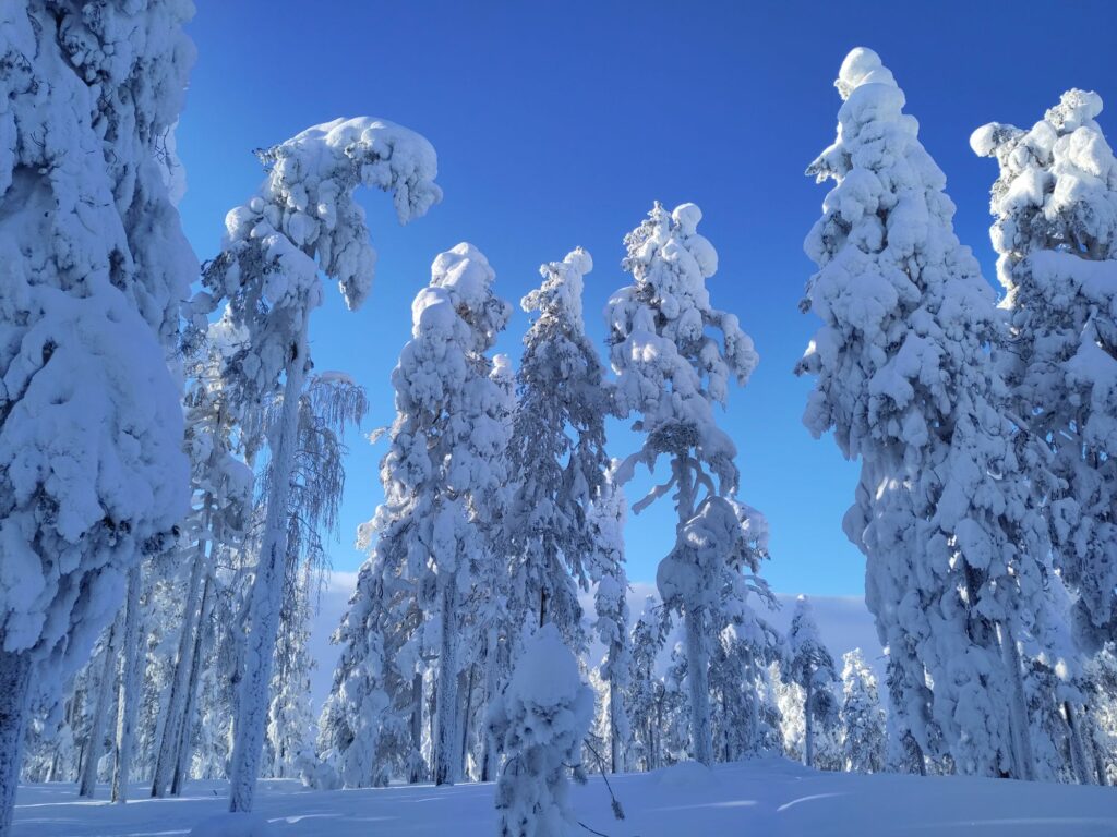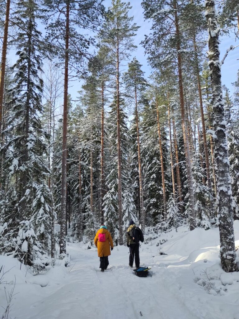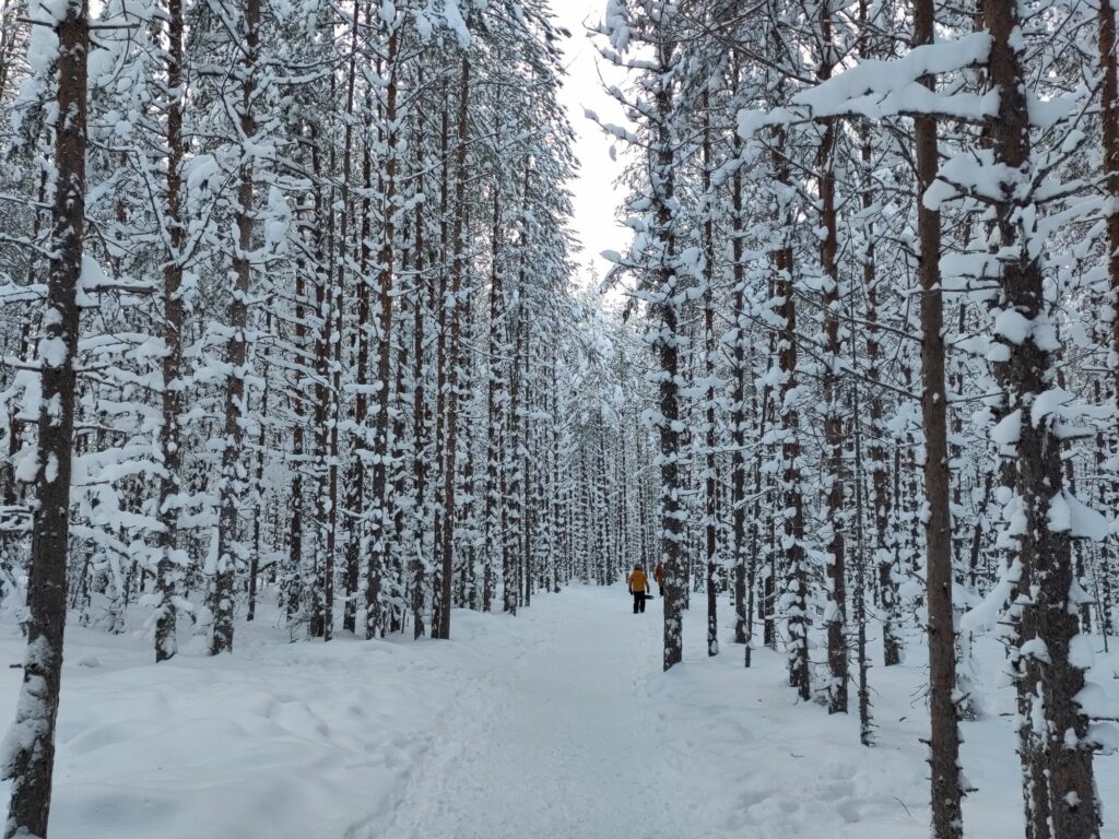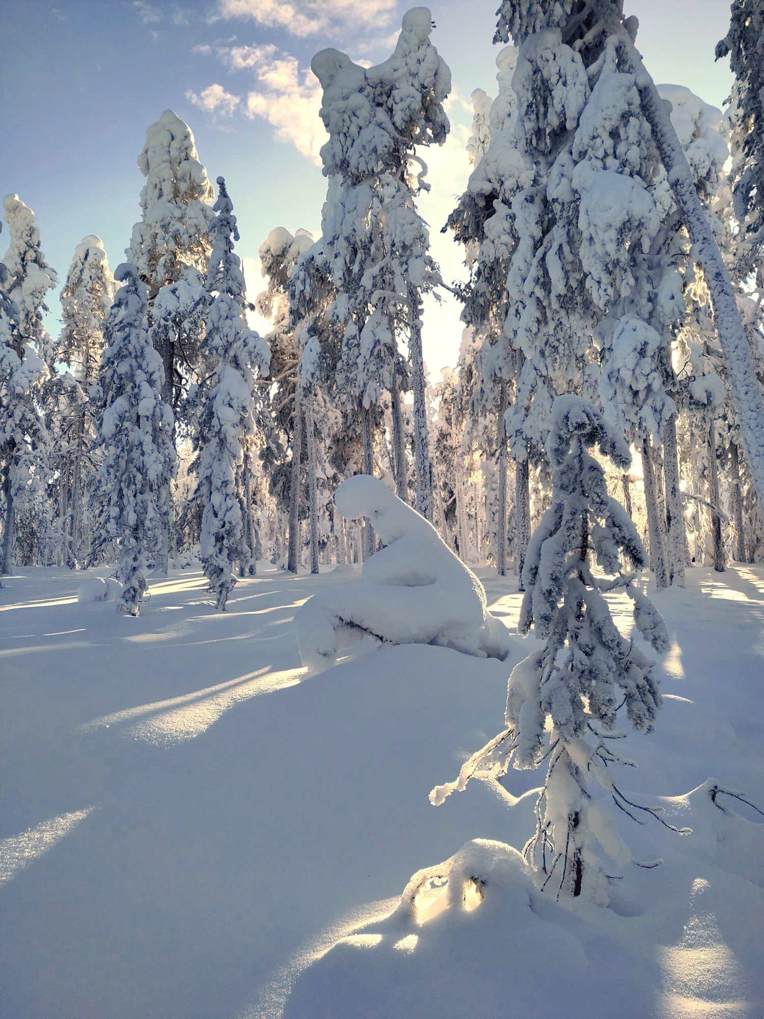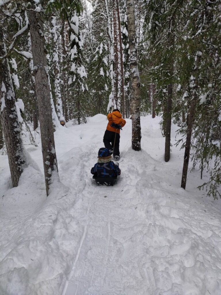 Le lendemain de notre arrivée, il y avait un soleil et un ciel bleu azur magnifiques. Avec ma maman et les gars, on est partis faire une randonnée à trente minutes d’ici, trouvée grâce au site Luonton qui référence les sentiers de marche partout en Finlande. Nous on est super contentes et émerveillées du paysage qui ne ressemble à rien de ce qu’on a pu admirer de toute notre vie, avec quelques sapins à la fameuse forme de sucre d’orge. Achille et Solal ne sont quant à eux pas hyper emballés et correspondent parfaitement au stéréotype des enfants qui veulent tout faire sauf coopérer. Ils veulent manger / ah non en fait ils n’ont plus faim / c’est trop loin / c’est bientôt fini ? / casser la neige sur les sapins sucre d’orge / maman tire moi dans la luge / j’ai envie de faire pipi / mais c’est interminable on fait que des trucs pour les adultes. Ambiance.
