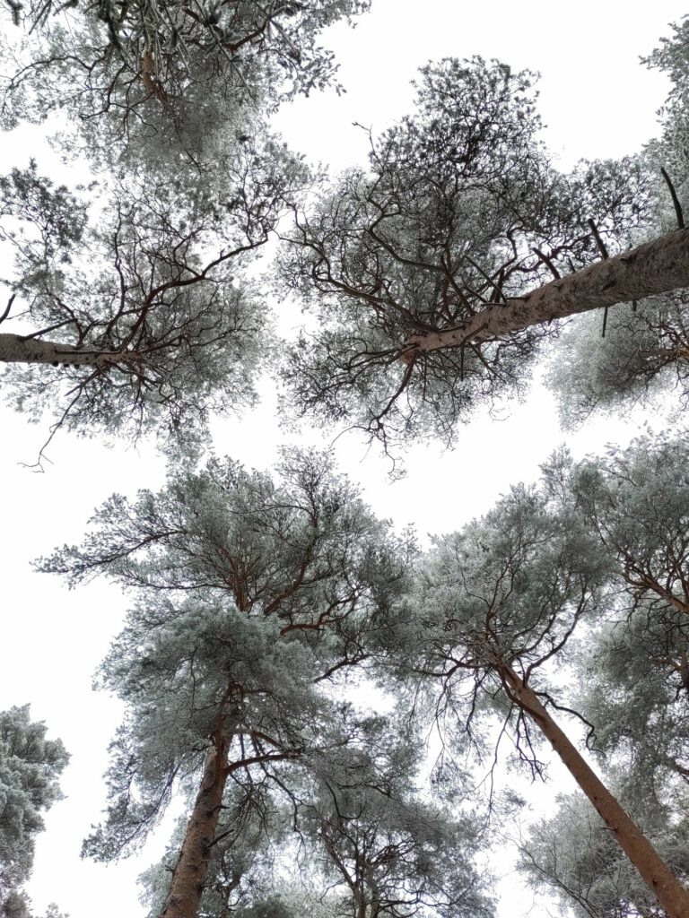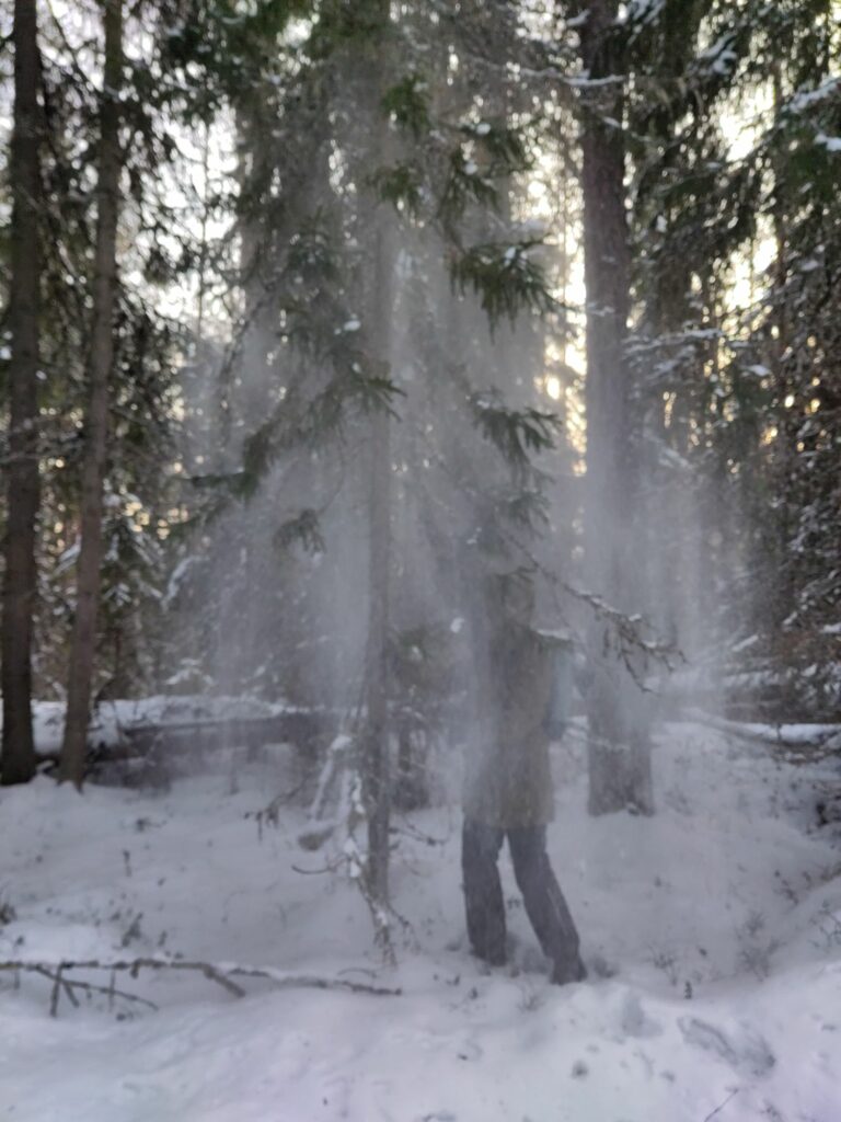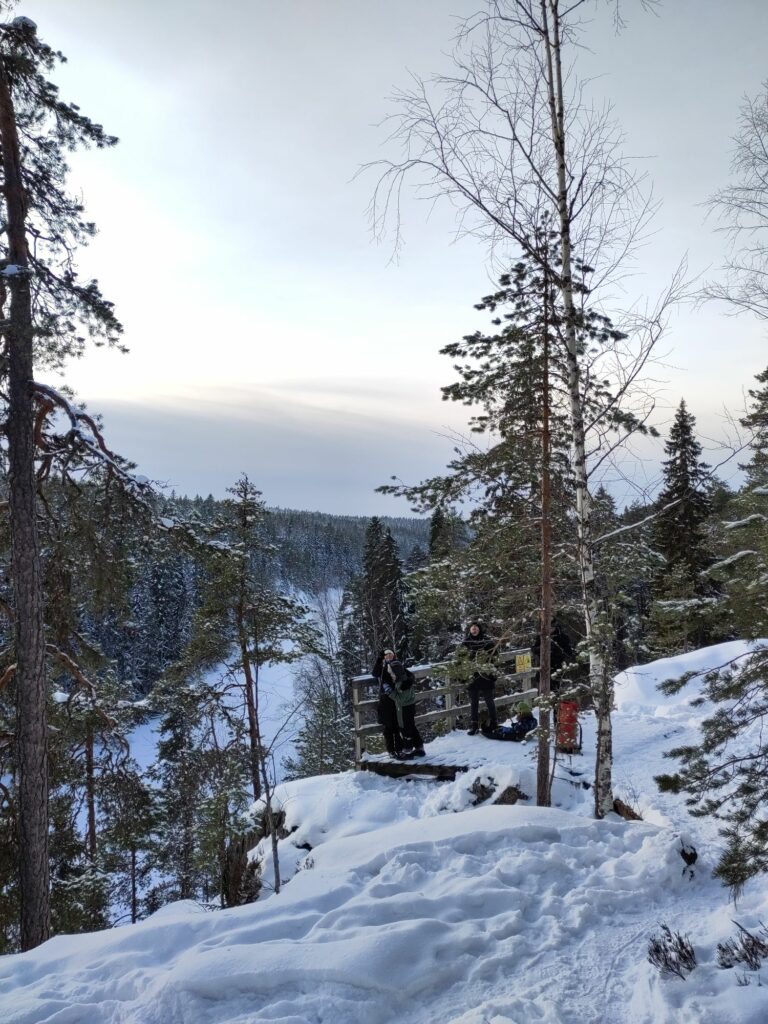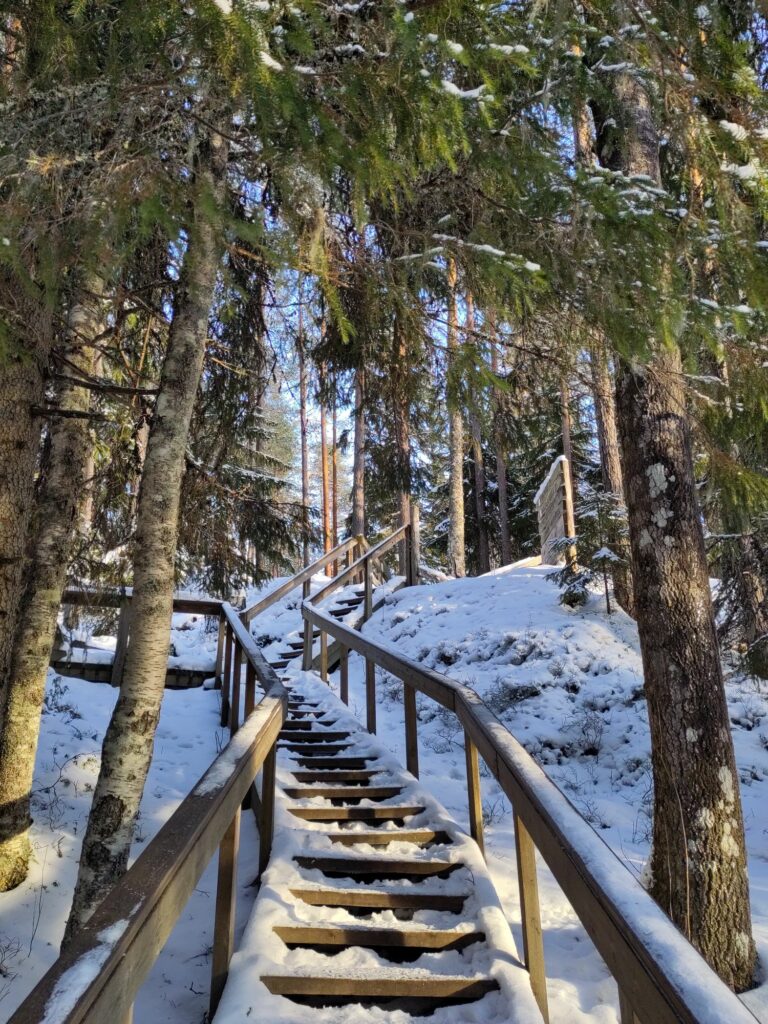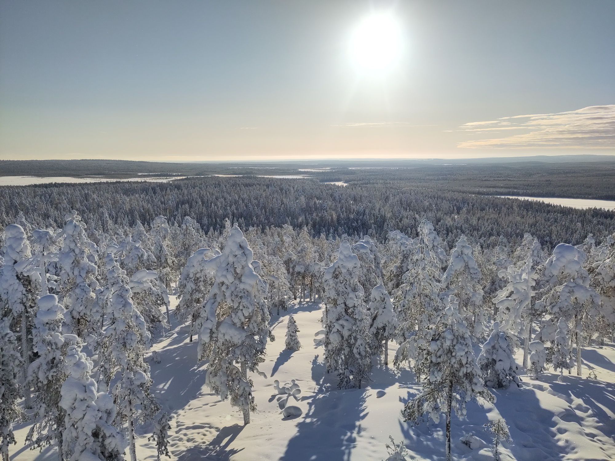 Le lendemain de notre arrivée, il y avait un soleil et un ciel bleu azur magnifiques. Avec ma maman et les gars, on est partis faire une randonnée à trente minutes d’ici, trouvée grâce au site Luonton qui référence les sentiers de marche partout en Finlande. Nous on est super contentes et émerveillées du paysage qui ne ressemble à rien de ce qu’on a pu admirer de toute notre vie, avec quelques sapins à la fameuse forme de sucre d’orge. Achille et Solal ne sont quant à eux pas hyper emballés et correspondent parfaitement au stéréotype des enfants qui veulent tout faire sauf coopérer. Ils veulent manger / ah non en fait ils n’ont plus faim / c’est trop loin / c’est bientôt fini ? / casser la neige sur les sapins sucre d’orge / maman tire moi dans la luge / j’ai envie de faire pipi / mais c’est interminable on fait que des trucs pour les adultes. Ambiance.