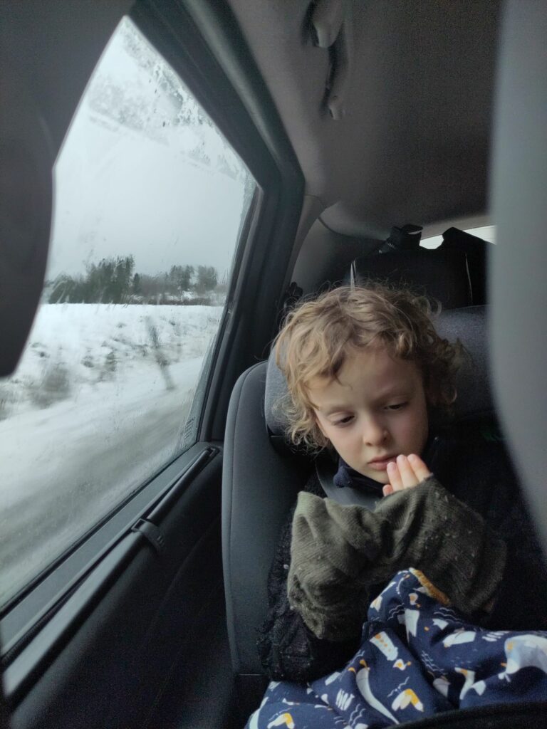 Mais on garde encore un peu ma maman, avec qui nous sommes sur la route pour Rovaniemi. D’ailleurs, photo de Solal qui joue avec le trou dans sa chaussette tandis que j’écris cet article dans la voiture: