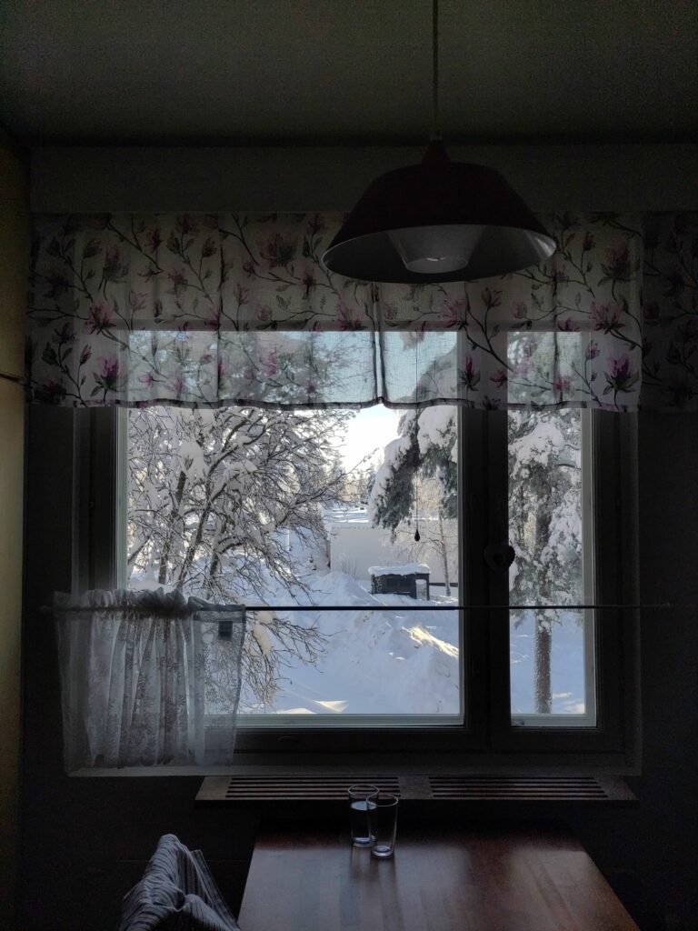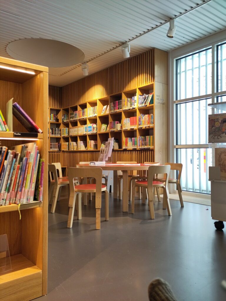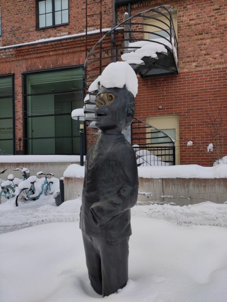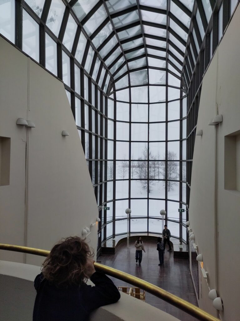 Nous logions dans un appartement appelé « l’appartement du Père Noël », rien que ça. Le paillasson avait pourtant une image de pin-up sur une voiture, avec des formes ressemblant vaguement à des lettres, c’était un paillasson fait par IA. Les fenêtres immenses, et sans rideaux, stores ou volets, donnaient sur un bout de forêt dont les arbres enneigés tenaient déjà du conte de fée. Je précise sans rideau, parce qu’avec la neige et les éclairages de la ville, on y voit presque comme en plein jour en pleine nuit. Maxime a fait du télétravail toute la semaine, tantôt sur un fauteuil, tantôt sur une chaise contre un mur dans la chambre pendant que les enfants faisaient des saltos sur le canapé. Le dernier jour, il s’est délocalisé à la bibliothèque, chef d’oeuvre d’architecture d’Alvar Aalto (et son ordi est tombé en panne, il a dû le réinstaller entièrement).