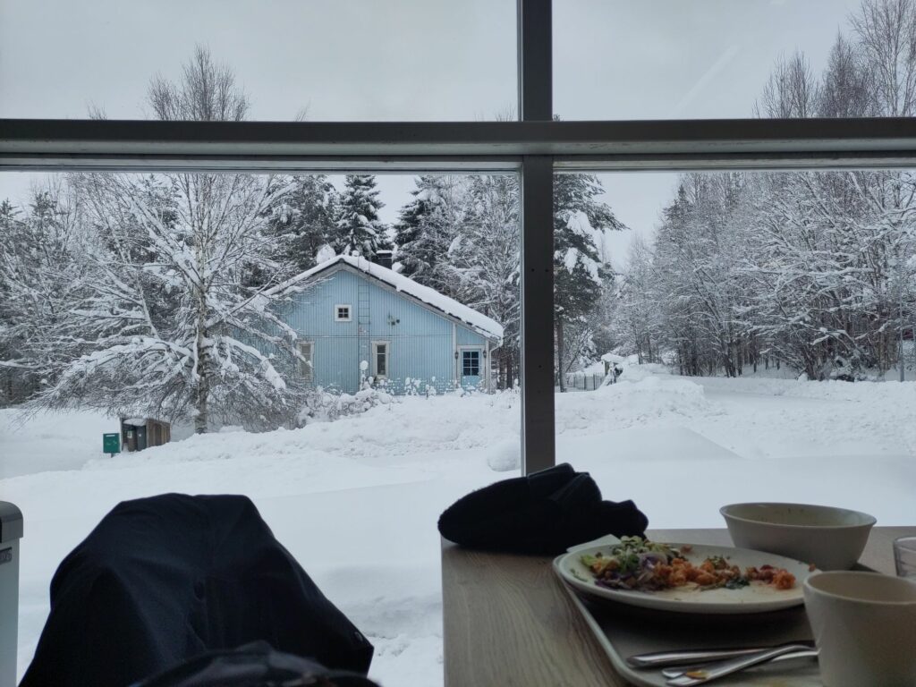 Un autre jour on est allés tester un lounas (c’est le terme qui désigne le déjeuner pris en mode buffet en Finlande, et qui est très répandu). On a goûté une soupe typique d’ici « Lapin Ukon keitto ». Contrairement à ce qu’on pourrait penser ce n’est pas avec du lapin (Lapin désignant la Laponie) mais avec de la viande de renne émincée en morceaux très fin et du fromage. C’était très bon.