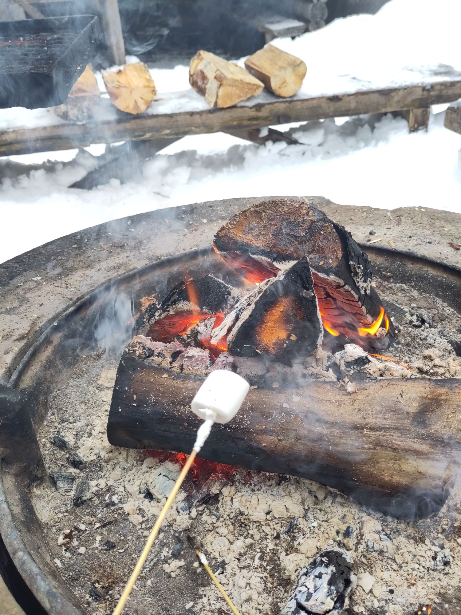 L’avant dernier jour, nous avons fait une dernière promenade dans la nature. Avec la neige qui fond, les arbres ont perdu leur manteau, le paysage change. Au milieu de la randonnée, il y avait des feux déjà allumés, l’occasion de griller quelques chamallows glissés dans le sac au cas où. Un geai de Sibérie nous a rendu visite, en prélude de la visite au zoo de Ranua prévue pour le lendemain.