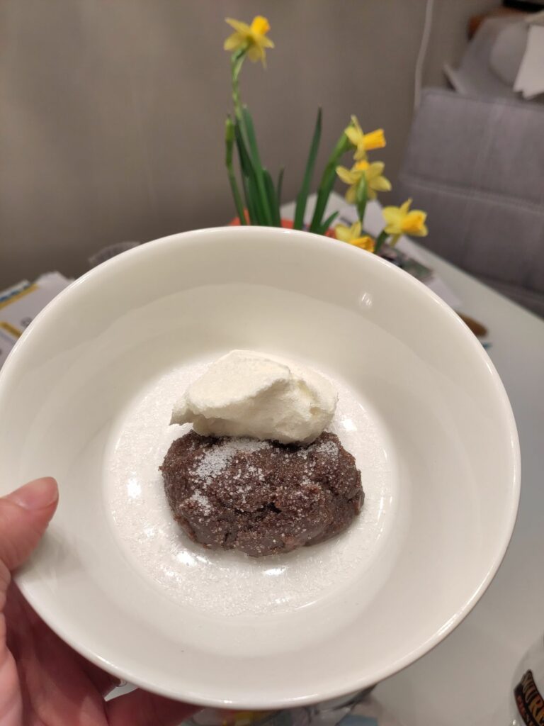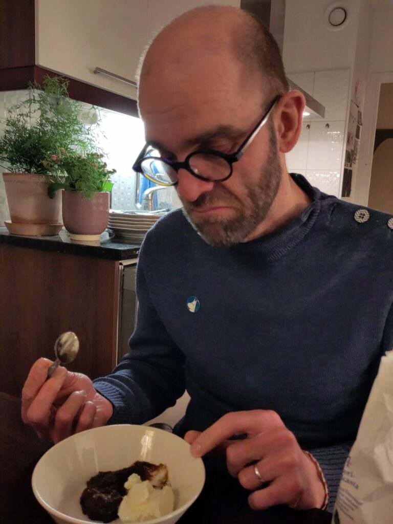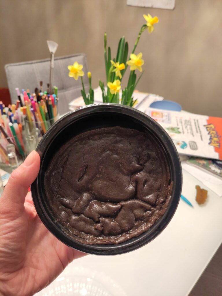 L’aspect donne l’impression qu’on va manger du flan au chocolat, ça sent plutôt bon. Avant de se lancer dans cette dégustation il a fallut faire des recherches pour savoir comment manger le mämmi: chaud, froid, à même la boîte…