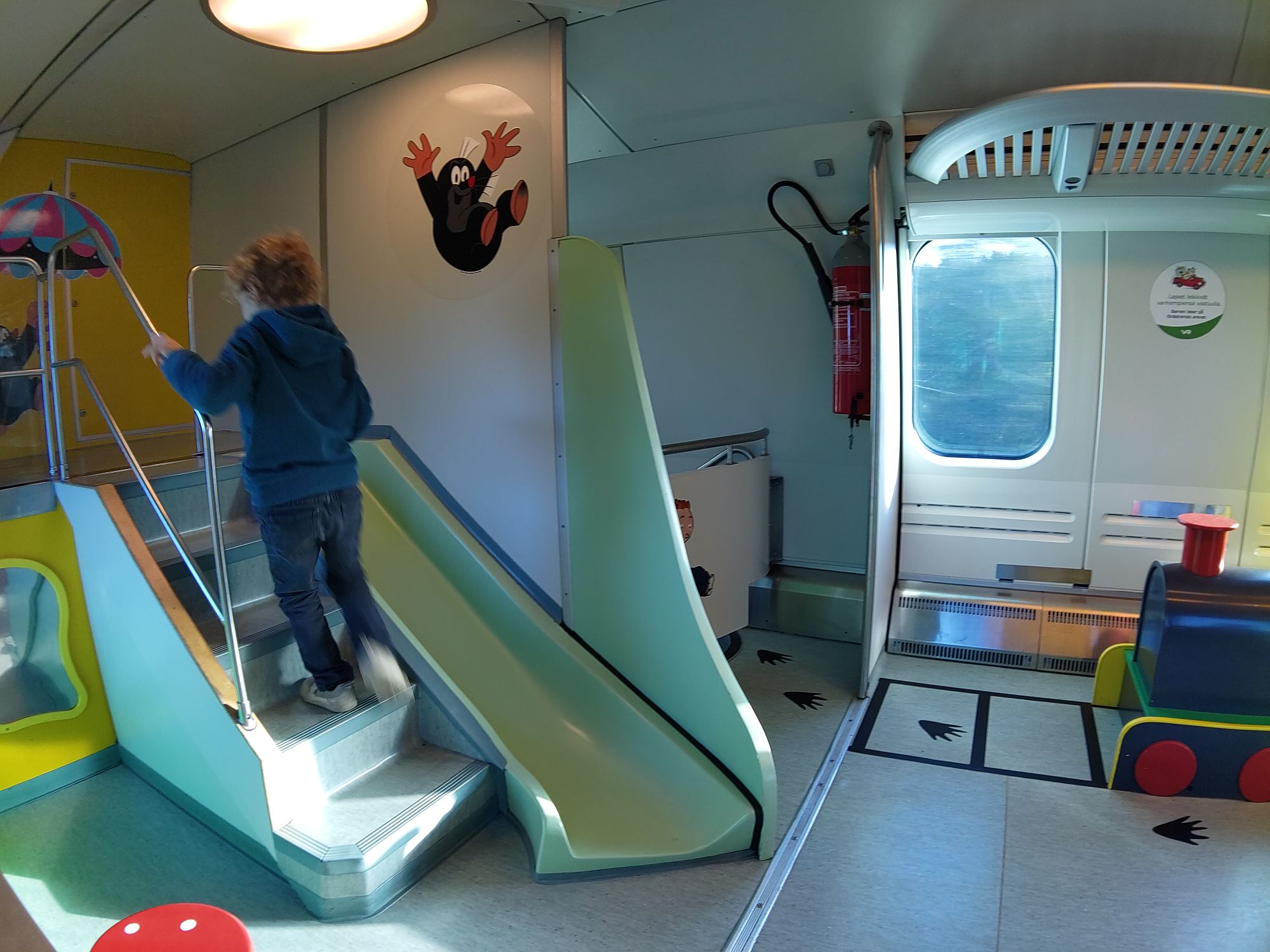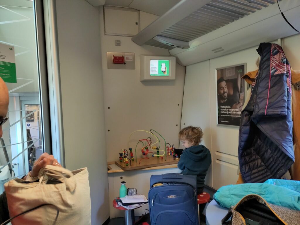D’abord, le train. Une petite centaine d’euros aller pour nous quatre, avec un compartiment famille rien que pour nous, dans le wagon qui dispose d’une aire de jeu pour les enfants. Ça ne manquait pas non plus d’interrupteurs, Solal, qui en est passionné en ce moment, les a tous essayés.