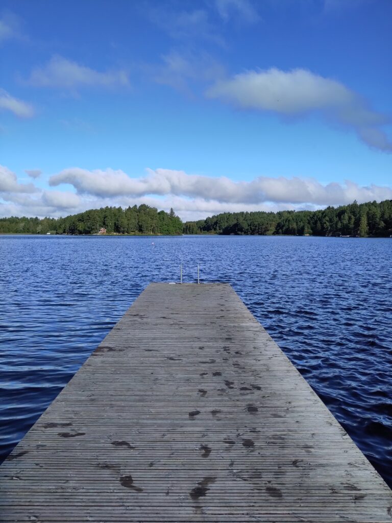 J’entre, la chaleur est si bonne, j’avais froid dehors, c’est parfait. Je m’assois sur la place à droite en entrant, à l’opposé du poêle (ou tout autre nom que porte le truc qui chauffe avec des pierres dessus). Là, ceux qui savent sourient. Je comprend vaguement « lämmin » et « kuuma », et une lumière s’allume dans mon cerveau, lämmin = chaud, kuuma = très chaud. Je suis au point le plus chaud du sauna. Les dames sont pleines d’attention, me demandent si je veux changer de place, mais j’avais froid, ça tombe bien ça me réchauffe, et mon amour propre mal placé me dicte de rester là. Une dame met de l’eau sur les pierres, une vague de chaleur arrive jusqu’à moi. Puis une autre, et encore une, à chaque fois elle me regarde pour vérifier mon approbation (ou que je ne vais pas tomber dans les pommes peut-être), et à chaque fois tout mon corps transpire en même temps que mon coeur s’accélère. Je parviens à baragouiner « okay now it’s enought for me » avec un sursaut dans la voix. Je remets mon maillot, je sors, je marche sur les planches fraîches, le ciel moutonne, l’eau miroite, le soleil éclaire la rive en face, les arbres, la cabane rouge, tout est beau, je rentre dans l’eau en descendant par la petite échelle au bout du ponton, je me délecte dans une quasi ivresse, du contraste entre la chaleur de ma peau et la fraicheur de l’eau.