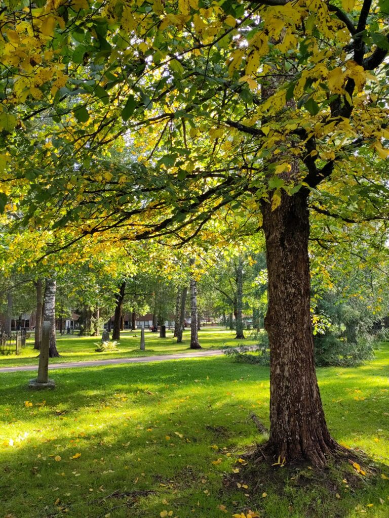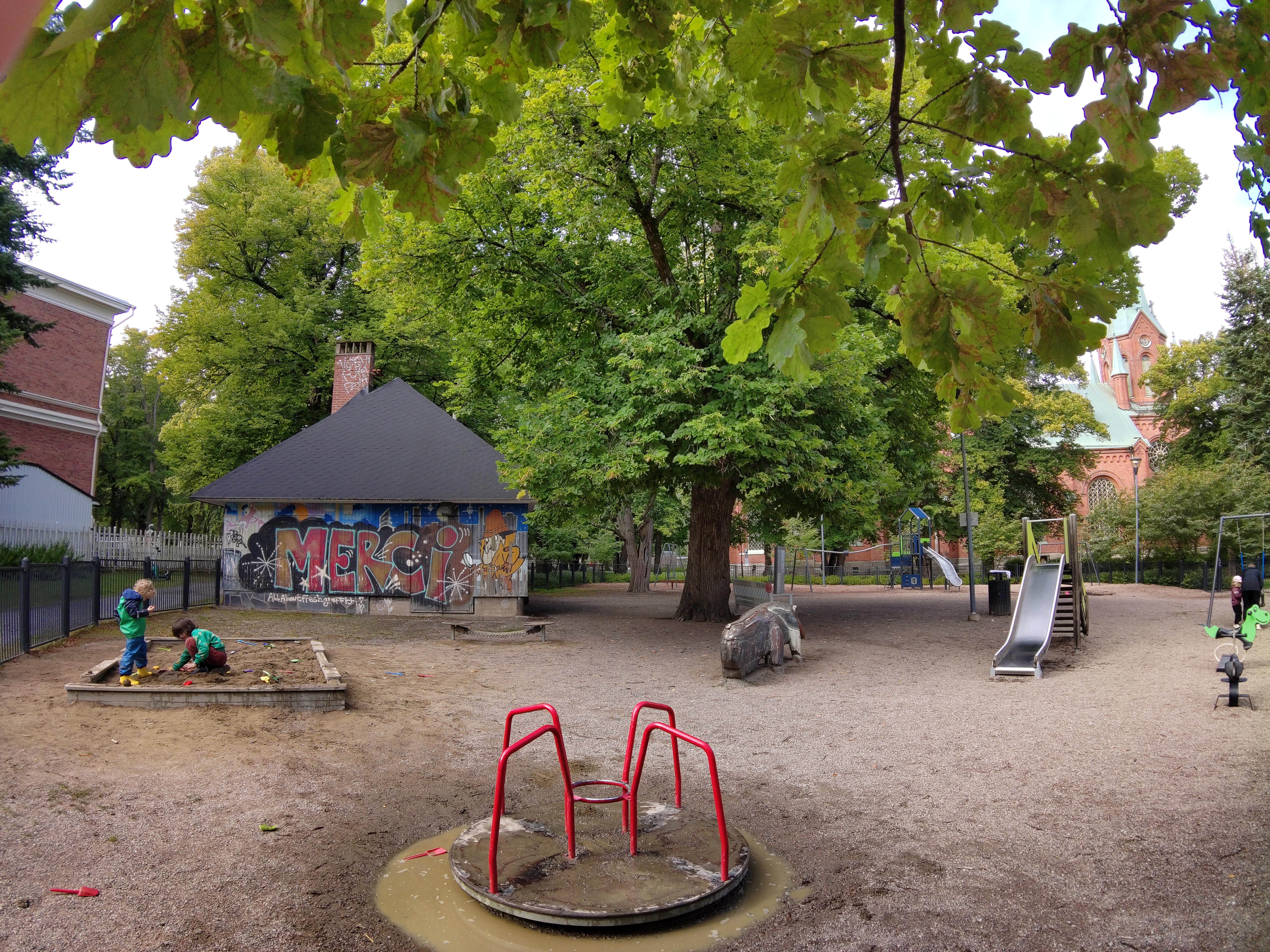 En rentrant de l’école de Solal, on traverse « Pyynikin kirkkopuisto », le parc de l’église Alexandre (je ne suis pas sûre de cette traduction hasardeuse), qui est parsemé de tombes très anciennes, pour la plupart datant du 18e ou 19e siècle. On adore voir le soleil à travers les feuilles et les nombreux écureuils qui grignotent des glands dans les chênes et font tomber leurs épluchures dans nos cheveux.