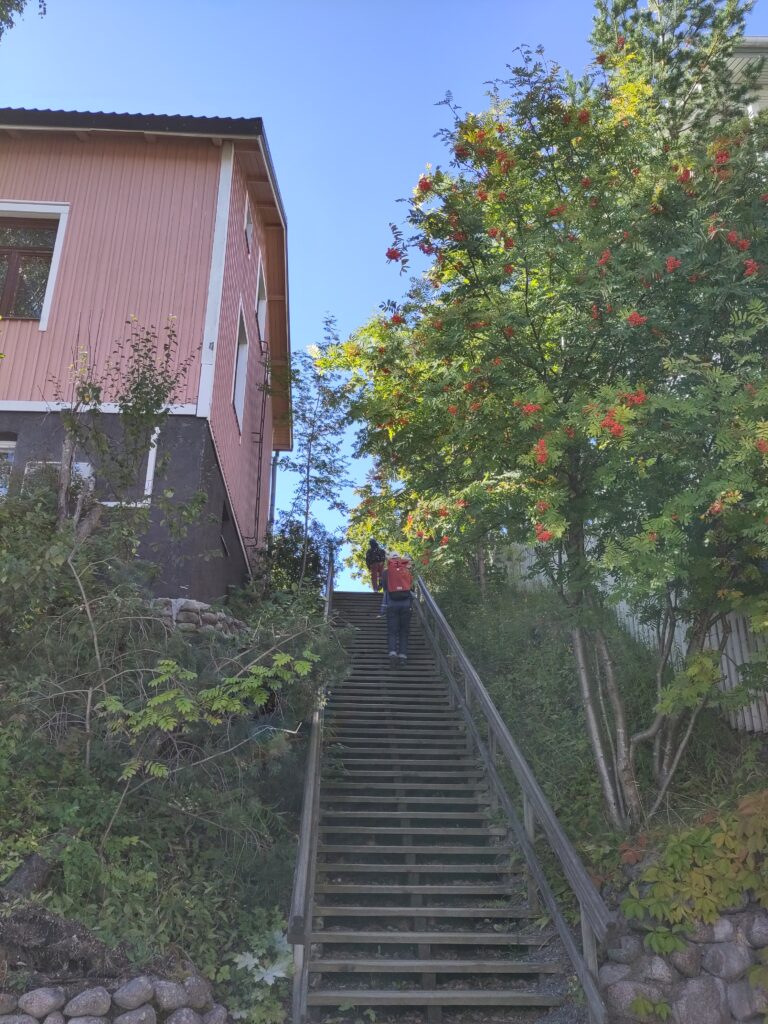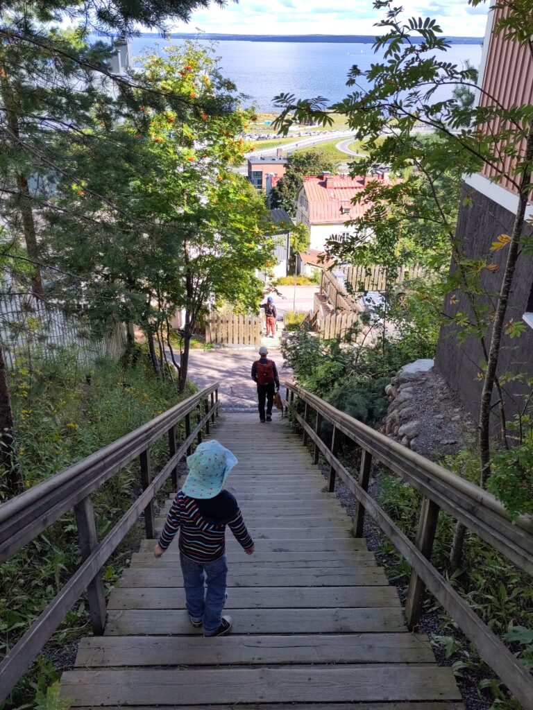 De chaque côtés de l’esker, des escaliers descendent vers l’un des deux lacs qui bordent la ville. On a opté pour le plus court, l’heure du déjeuner approchant, les forces quittent peu à peu certaines personnes de l’équipe.