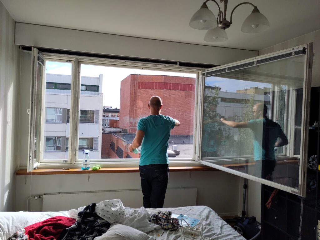 Les fenêtres de notre appartement sont doubles, en plus du double vitrage, comme dans notre air bnb à l’arrivée. Autant vous dire qu’on n’improvise pas le nettoyage des vitres entre deux tâches (je n’ai pas osé le « entre deux portes » mais le coeur y est), puisque pour une fenêtre composée de deux parties, ça fait 8 vitres.