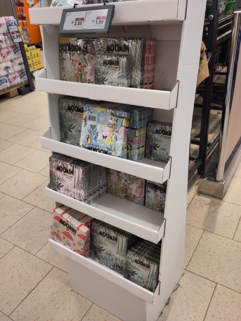 On trouve des Moomins sur tous supports: vêtements, aliments, emballages, vaisselle… Même le tramway en est couvert !