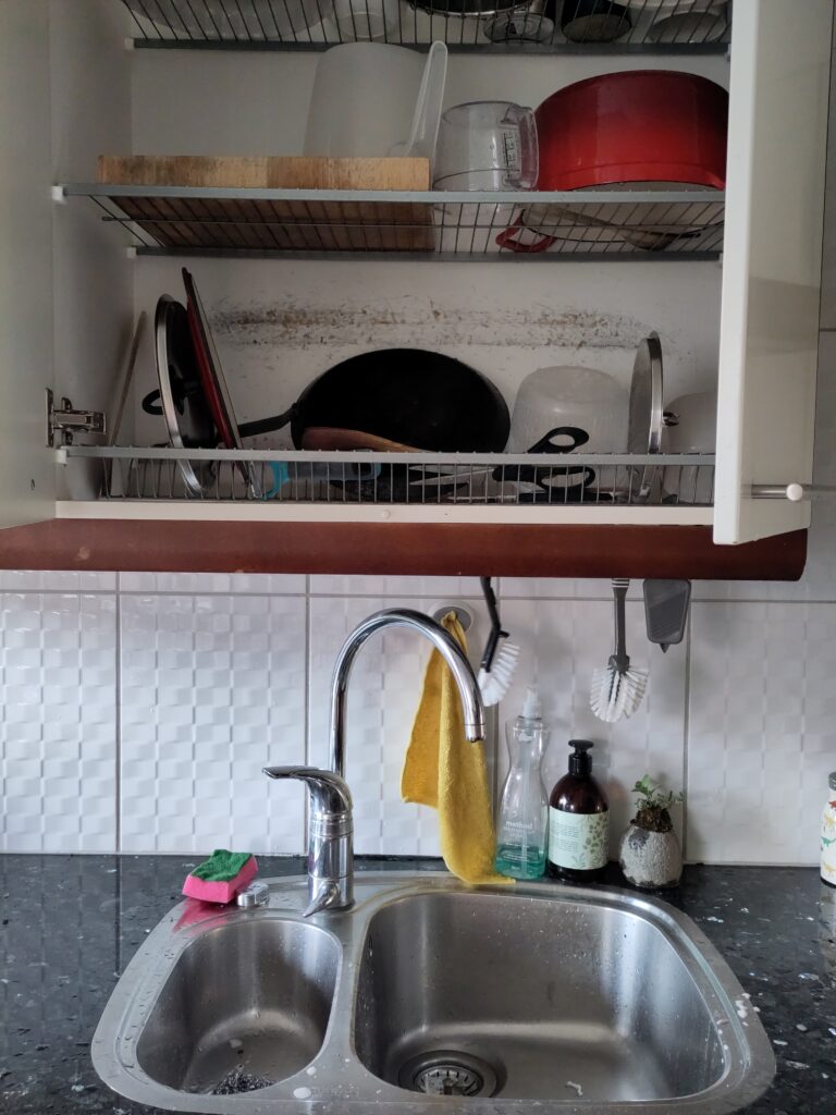 Il y a un placard-égouttoir au-dessus de l’évier, visiblement c’est une spécificité des cuisines finlandaises, et franchement c’est très pratique.